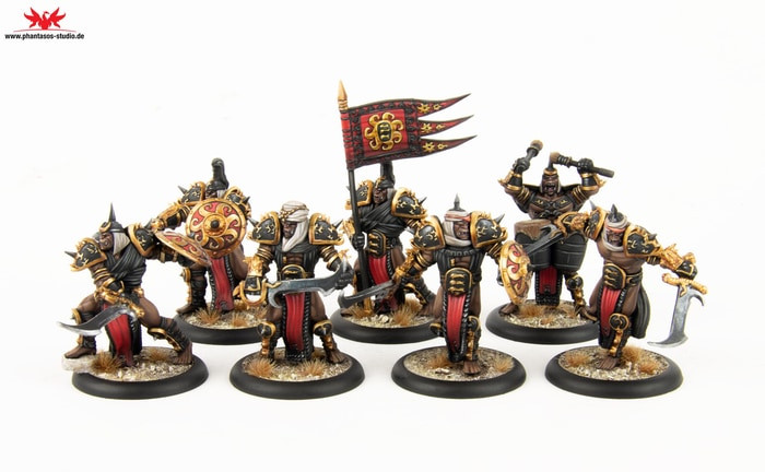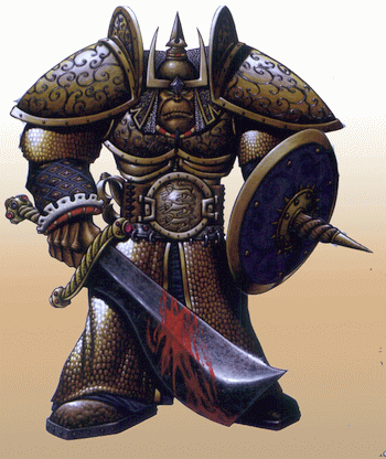 There is perhaps nothing as terrifying to an infantry as the sight of the Ogre Heavy Infantry taking the field of battle. Armed with huge Falchions easily the size of most dwarves, these savage warriors are the most fearsome units in the Blackblood army. While possessed of the same bloodlust that drives the rest of the Blackblood race, the Ogres have been able to focus their slaughter, making them both brutally dangerous and horribly organized.In some units of Heavy Infantry a Swordmaster may be found setting the pace for the unit. As if the sight of four-hundred pounds of enraged Ogre wouldn´t be unnerving enough, the swirling blades of the Ogre Swordmaster create a horrific image. Wielding two massive Falchions capable of slicing even the strongest armor, the Swordmaster strives to get into close melee with as many enemies as he can.