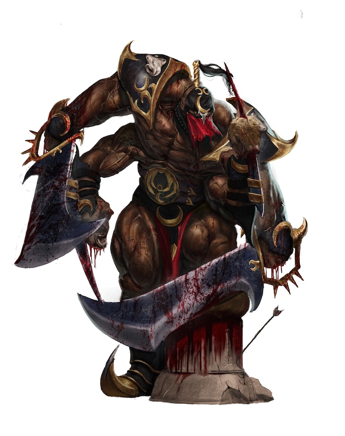 The Deathseeker Troll is the worst nightmare of the Firstborn soldier. Possessed of the strength of five men, armed to the teeth with cruel blades, protected by a thick natural hide and driven by a fanatically obsessive focus, a Troll Deathseeker emerging from an atacking force can cause opposing troops to break rank upon merely their foe.The number of Deathseeker Trolls is thankfully small, though this fact does little to bolster morale when they are seen. It is said that the Deathseeker Troll has looked into the "Long Night", a term they use to refer death, and has come away with its deepest secrets. possessed of none of the fears that death holds for most mortal races, the Deathseeker Troll will engage any foe, undertake any quest and brave any danger without hesitation.