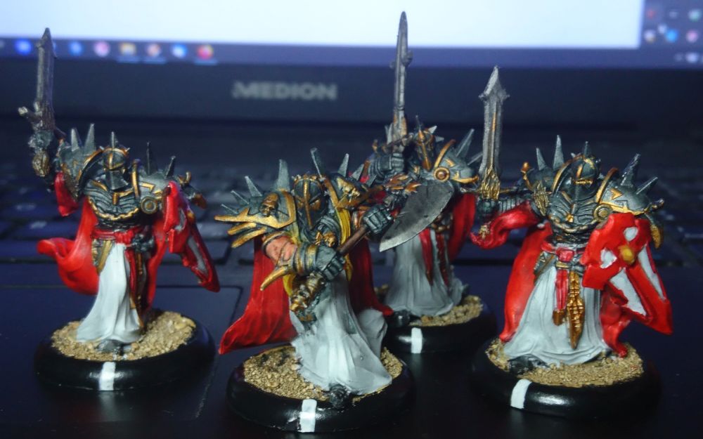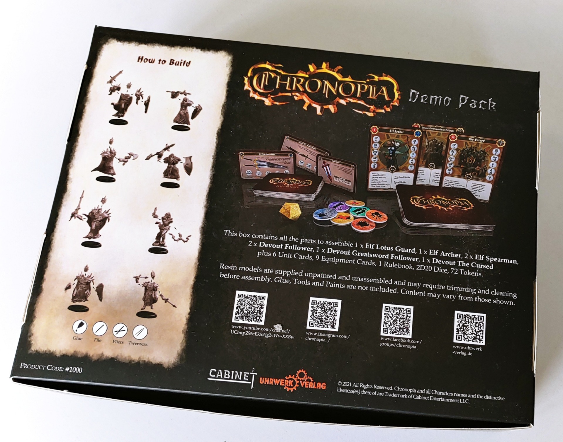 This box contains all the parts to assemble 1x Elf Lotus Guard, 1x Elf Archer, 2x Elf Spearman, 2x Devout Follower, 1x Devout Greatsword Follower, 1x Devout The Cursed plus 6 Unit Cards, 9 Equipment Cards, 1 Rulebook, 2D20, 72 Tokes.