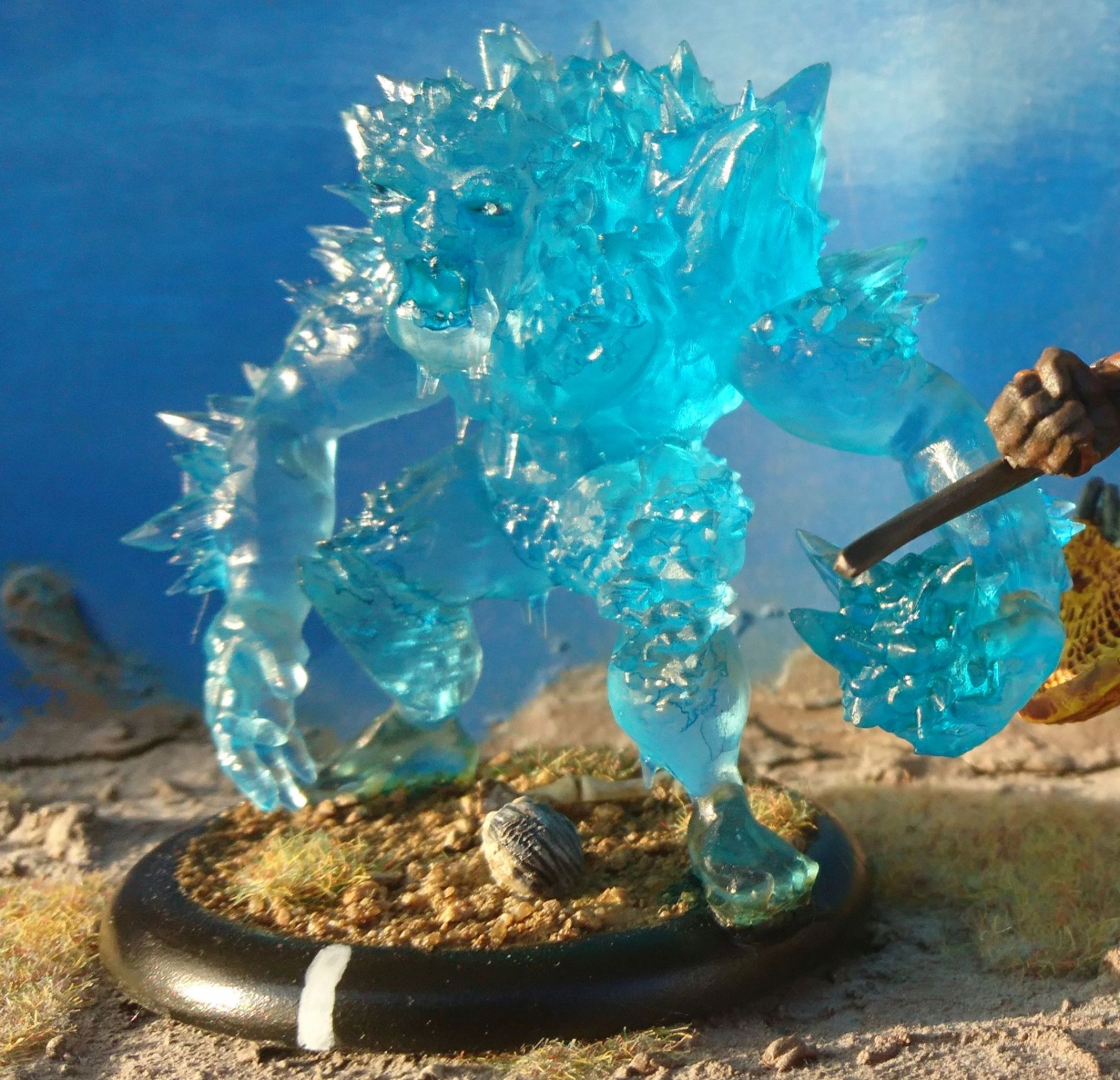Formed as a mass of frozen water animated by a Silver Lotus Eater, an Ice Elemental is deprived of consciousness or independent will, and instead is a manifestation of the whims of the mage that summoned it. Towering over three meters tall, its presence will usually tip the balance of a battle in the Zazen’s favour, before the magic that binds it unravels and the Elemental turns back into a pool of water.Images