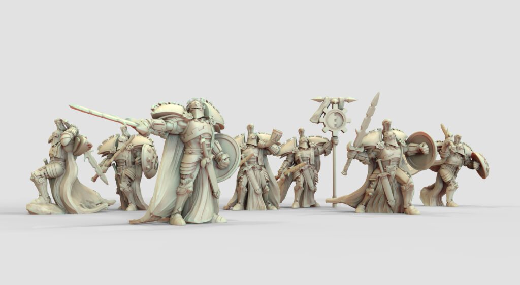 The Retinues of the One King are made up of both highly motivated soldiers as well as capable warriors. The Swordsmen warbands are one example of this. Trained to wield heavy blades in combat, the Swordsmen are the epitome of Firstborn chivalry. Trained for one year before being assigned to a warband, the Swordsman is thoroughly trained to function in a unit, to defend themselves and each other. It is often said that the Swordsmen of the Firstborn are like a many headed dragon, always alert and always dangerous.Bedecked in the colors of their units, the Swordsmen are as brilliant to observe on the battlefield as they are dangerous to fight against. Often accompanied by Greatswordsmen, the Sword Legions (as they are referred to within the kingdom), have never forgotten the life they had before the return of the One King and chant his praises before every battle in the event that this is their last chance to serve their liege lord.