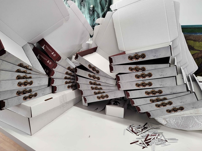 The treasures of your pledges have arrived at our stronghold in the United Kingdom. Once Border Reiver has passed, our scribes and quartermasters shall begin the sacred work of preparing and dispatching these long-promised parcels. Backers within the UK, stand ready — for an email bearing your tracking numbers shall soon ride forth to your inboxes like a herald before the host. Look forward for Royal Mail tracking email.